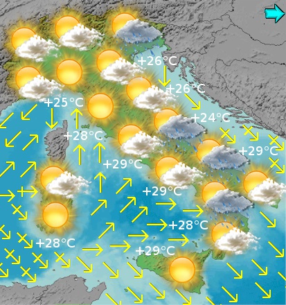 Venti perlopiù deboli sul mar Tirreno, sul mar Ionio e sul medio-alto Adriatico, più moderati sul medio-basso Adriatico.