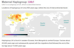All’aplogruppo mtDNA, io appartengo all’aplogruppo U4, l’aplogruppo U è comune in Europa, nell’Asia Occidentale e sopratutto nell’Asia Meridionale, la mutazione U4 giunse in Europa probabilmente prima dell’ultimo massimo glaciale, ossia circa 25000 anni fa, riscontro molte affinità con gli Inglesi, gli Scizzesi, i Germani e i Polacchi dal punto di vista genetico.